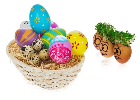 面白い怖いと髪のようなクレスとバスケットに驚いた漫画の顔で手描きのイースターエッグ 手作りの多色の卵は 優れた外国の個々の卵を見ます キャラクターの髪型のためにスタイル化されたクレソン の写真素材 画像素材 Image